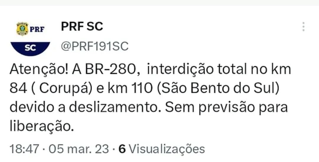 “Atenção! A BR-280, interdição total no km 84 ( Corupá) e km 110 (São Bento do Sul) devido a deslizamento. Sem previsão para liberação’