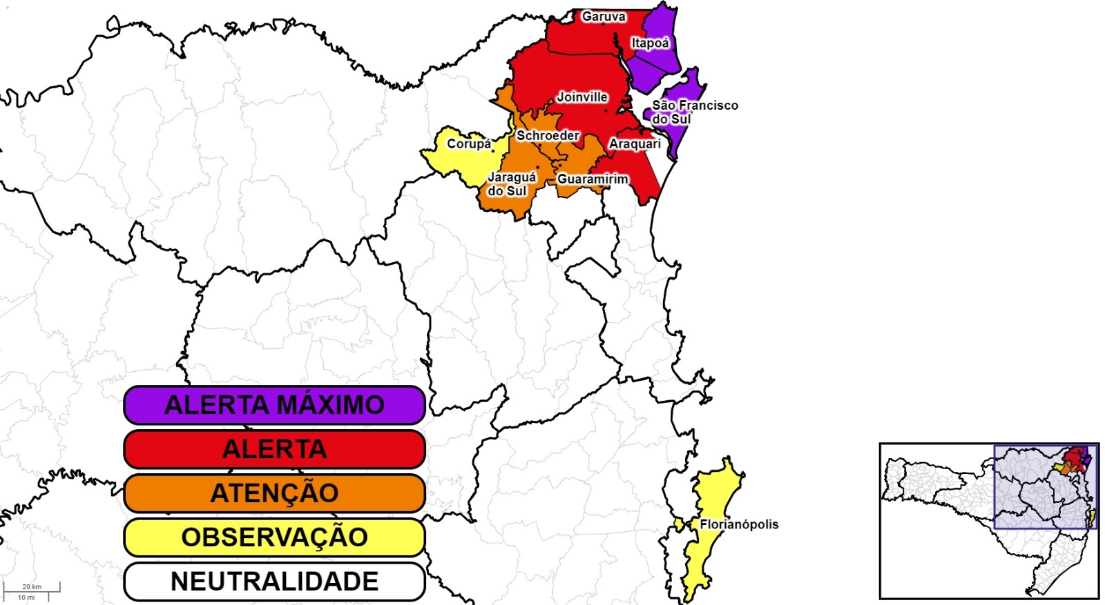 Municípios com risco para deslizamentos aumentado, devido a chuva persistente dos últimos dias. 23/01.