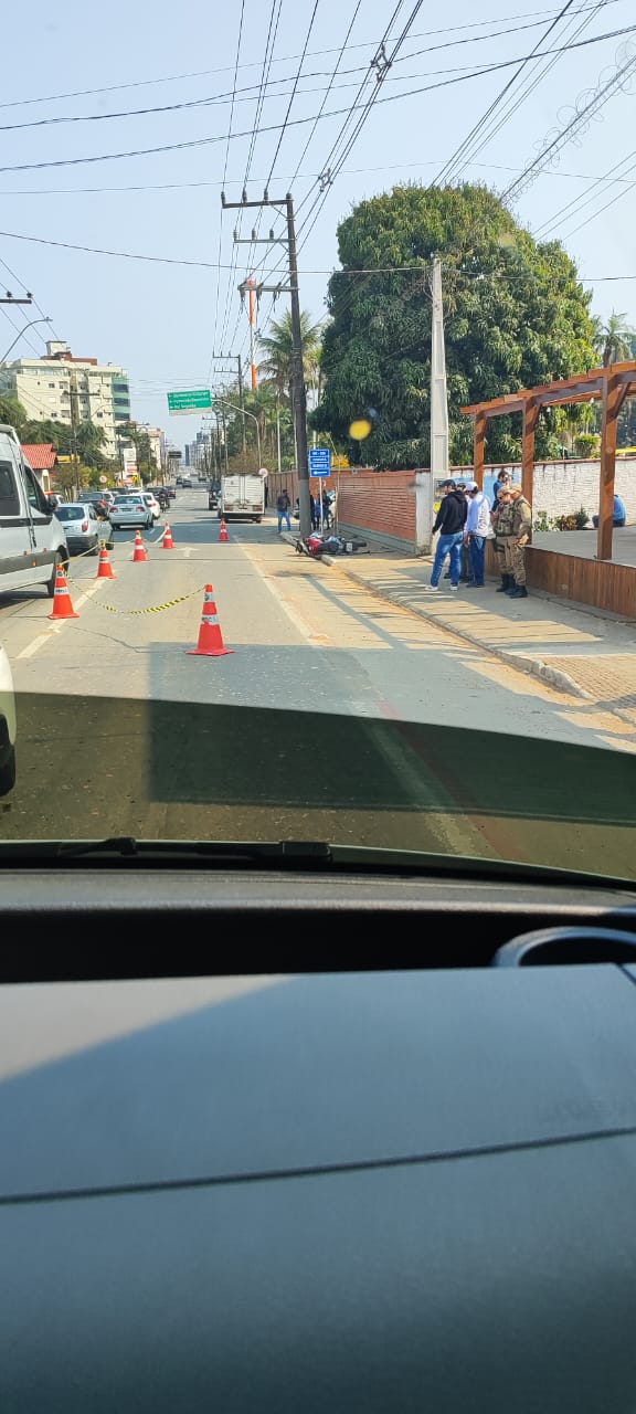 Por volta de 8h30 da manhã, os bombeiros atenderam uma ocorrência de batida entre moto e carro, na rua Roberro Zieman.