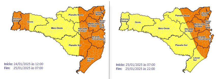 A Defesa Civil de Santa Catarina emitiu um alerta por conta de possíveis temporais entre a noite desta sexta-feira, 24, e a madrugada de sábado, 25, em todo o estado. Há também uma previsão para tempo instável e avanço de uma frente fria.