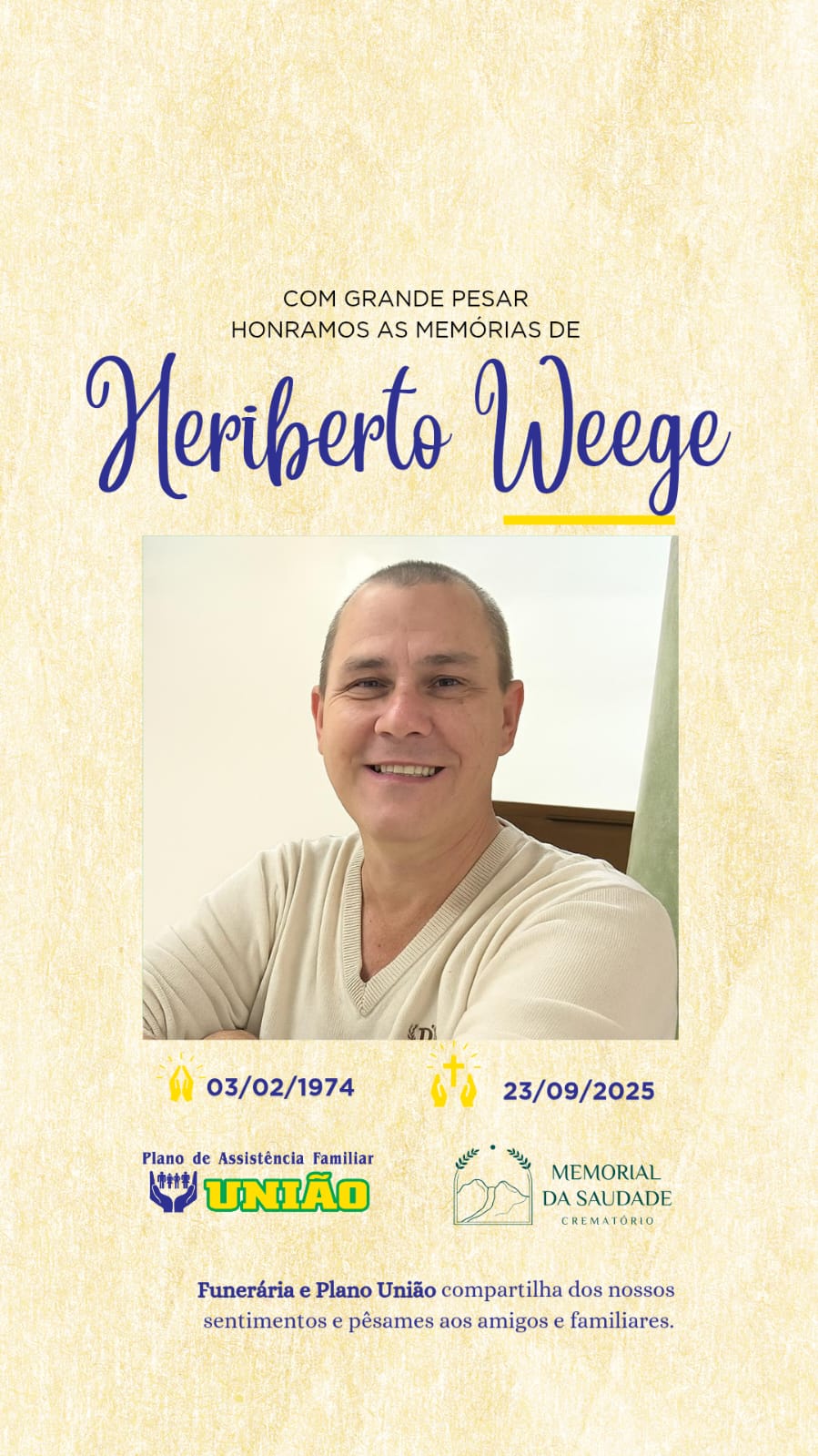 Faleceu nesta terça-feira 23/09 o Sr. HERIBERTO WEEGE com 51 anos..