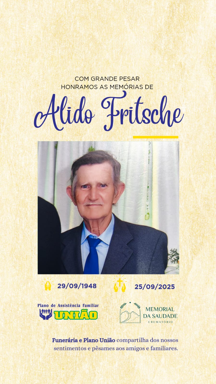 Faleceu nesta quinta-feira 25/09 o Sr. ALIDO FRITSCHE com 76 anos de idade.