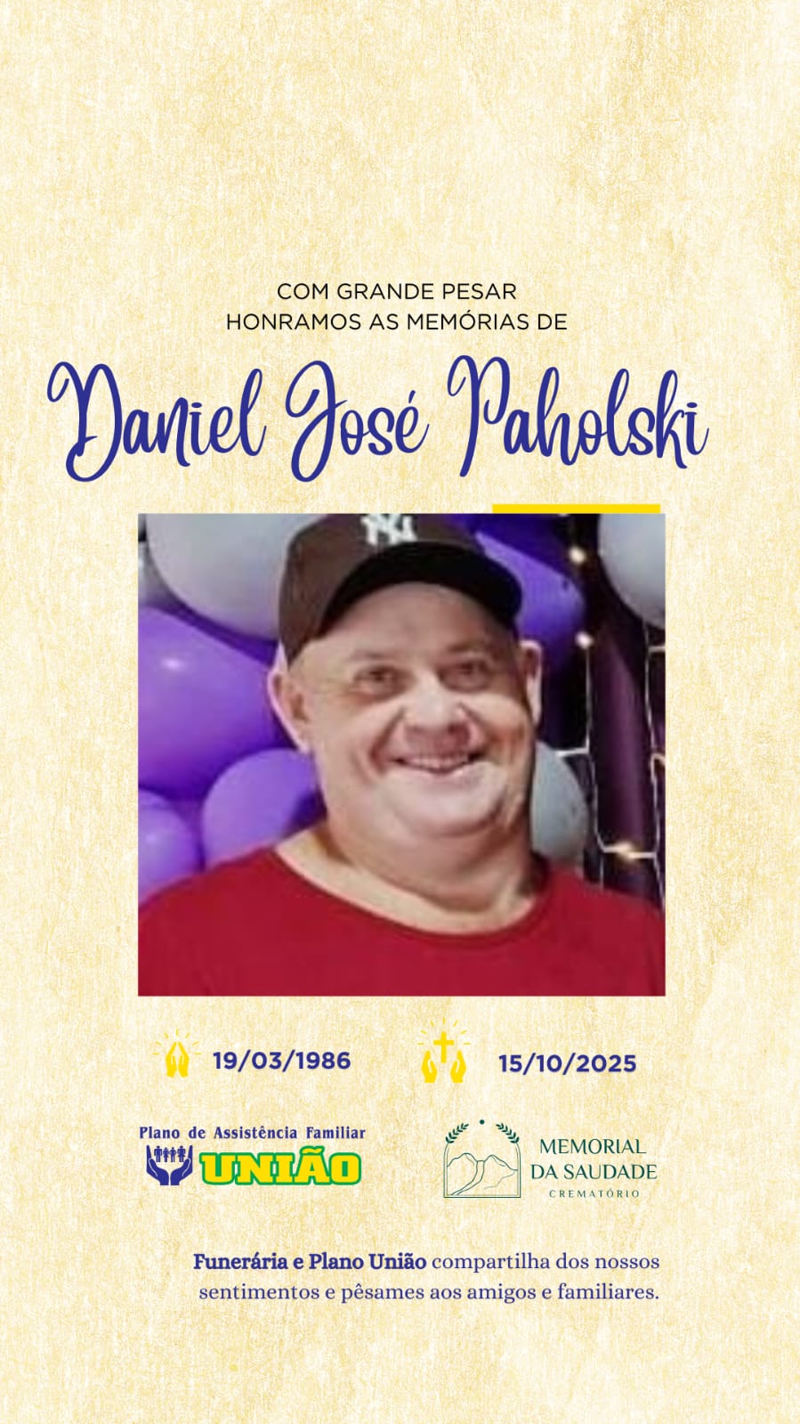Faleceu nesta quarta feira 15/10 o Sr DANIEL JOSÉ PAHOLSKI com 39 anos de idade.