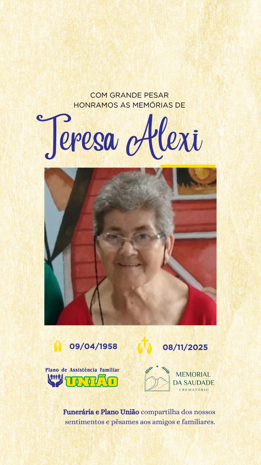 Faleceu neste sábado 08/11 a Sra. TERESA ALEXI com 67 anos de idade