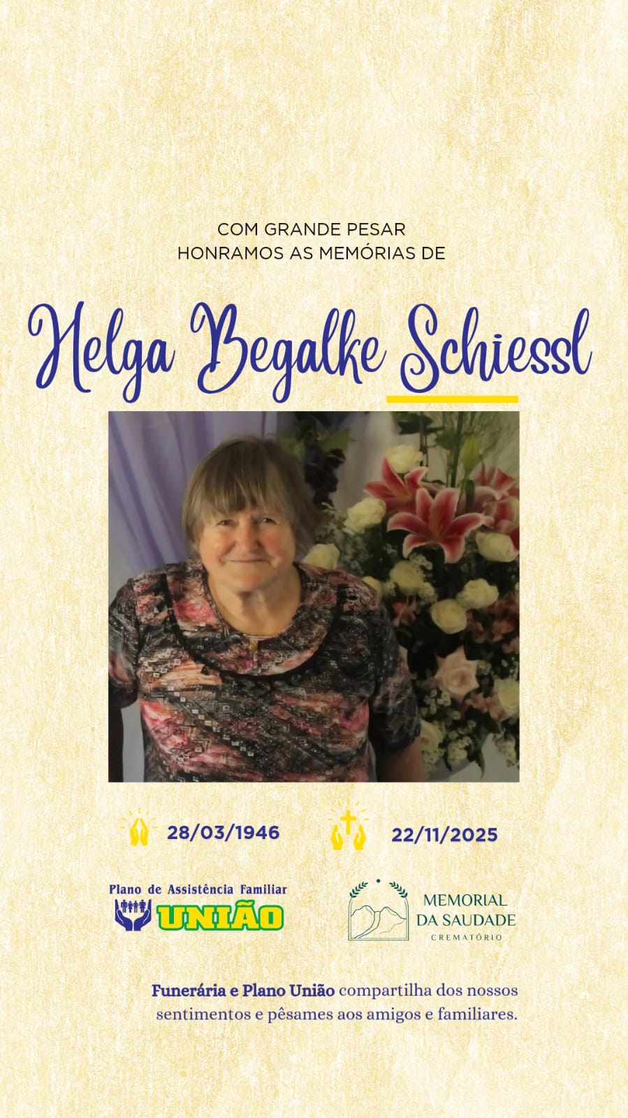 Faleceu neste sábado 22/11, a Sra HELGA BEGALKE SCHIESSL com 79 anos de idade