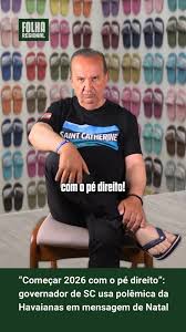 O governador de Santa Catarina, Jorginho Mello (PL), publicou uma mensagem de Natal em suas redes sociais com referências à polêmica envolvendo a Havaianas. Na publicação desta quarta-feira (24), ele aparece usando um chinelo em um fundo semelhante ao da campanha publicitária estrelada por Fernanda Torres.