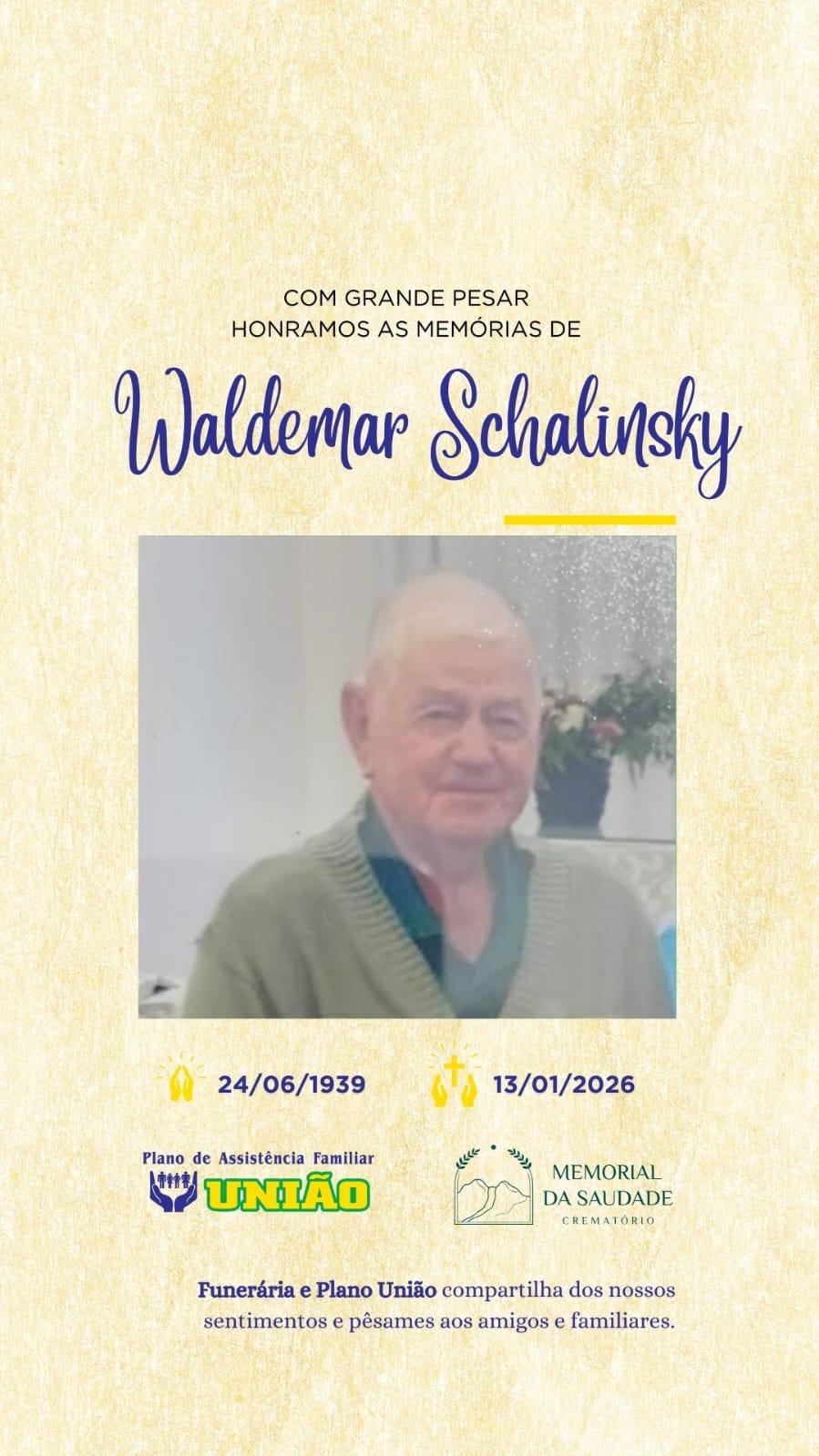 Faleceu nesta terça-feira 13/01 o Sr. WALDEMAR SCHALINSKY com 86 anos de idade