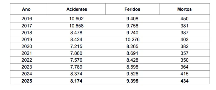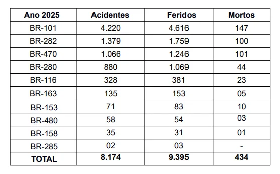 As rodovias federais que cortam Santa Catarina voltaram a registrar números alarmantes em 2025. Dados divulgados pela Polícia Rodoviária Federal (PRF) apontam que, ao longo do ano, foram contabilizados 8.174 acidentes, que deixaram 9.395 pessoas feridas e provocaram a morte de 434 vítimas ainda no local das ocorrências.