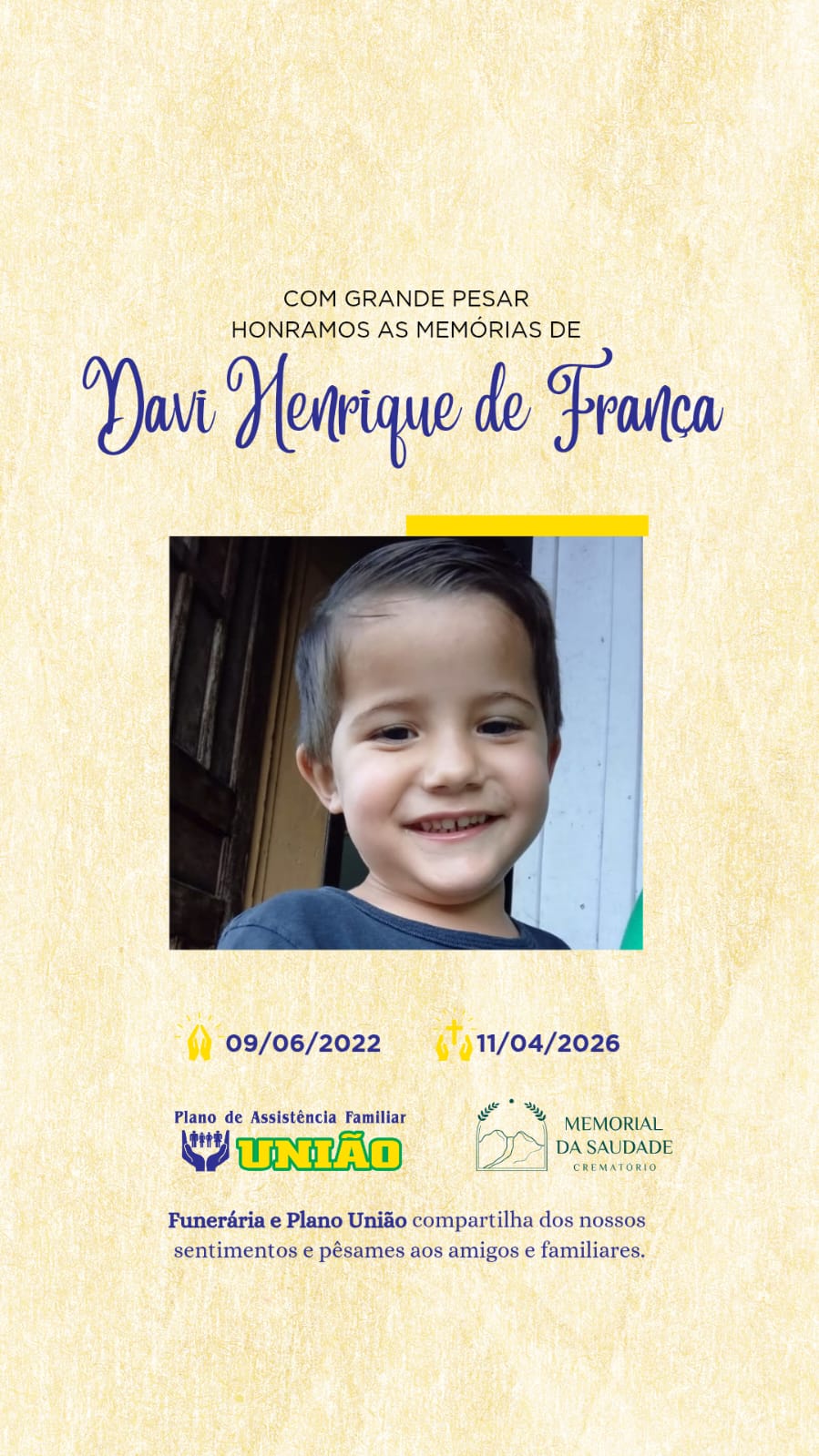 Faleceu neste sábado 11/04 o garotinho DAVI HENRIQUE DE FRANÇA com 3 anos de idade