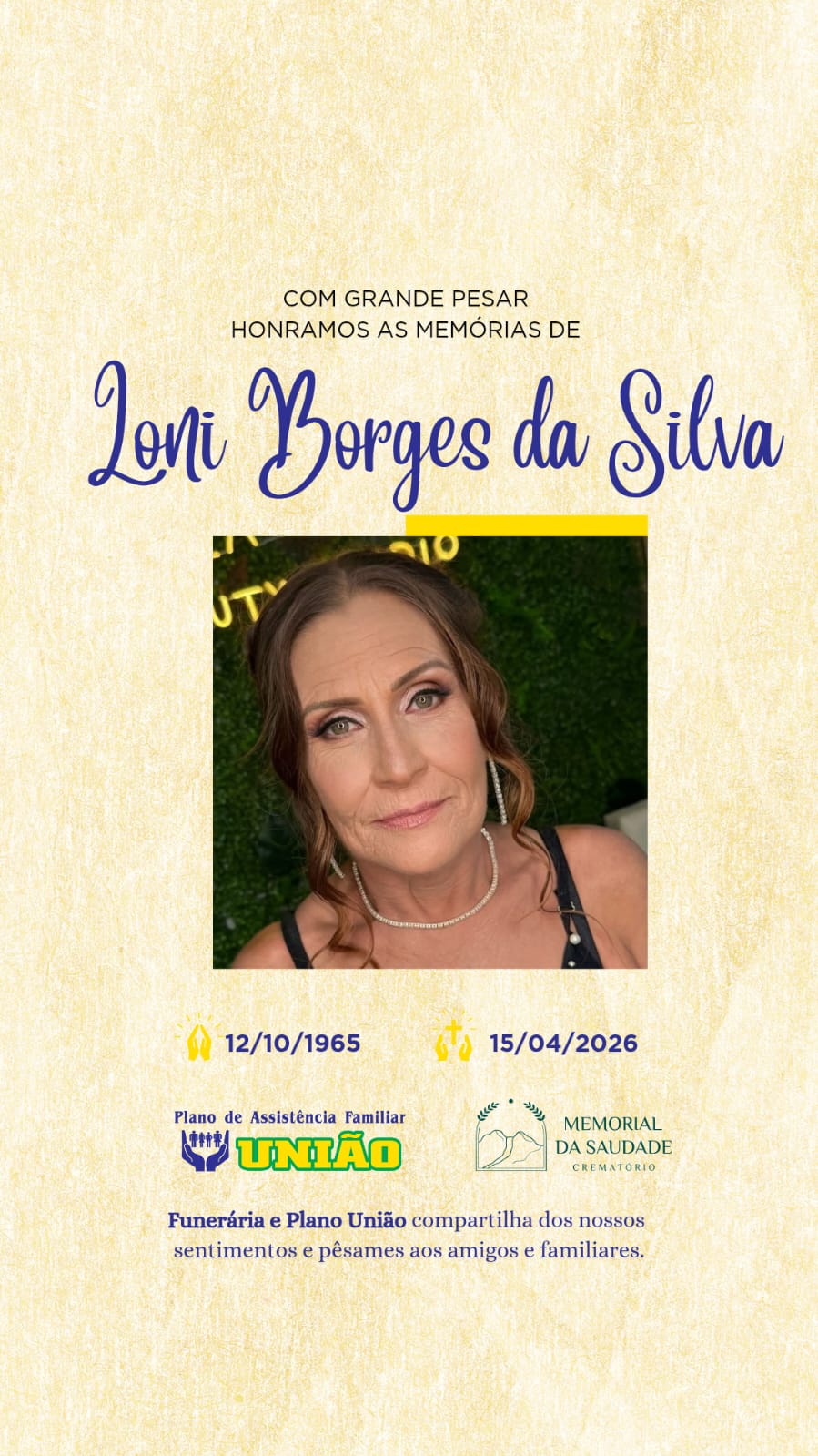 Faleceu nesta quarta feira 15/04 a Sra LONI BORGES DA SILVA com 60 anos de idade