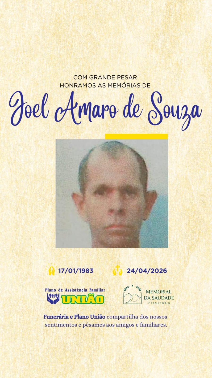 Faleceu nesta sexta-feira 24/04 o Sr JOEL AMARO DE SOUZA com 43 anos de idade