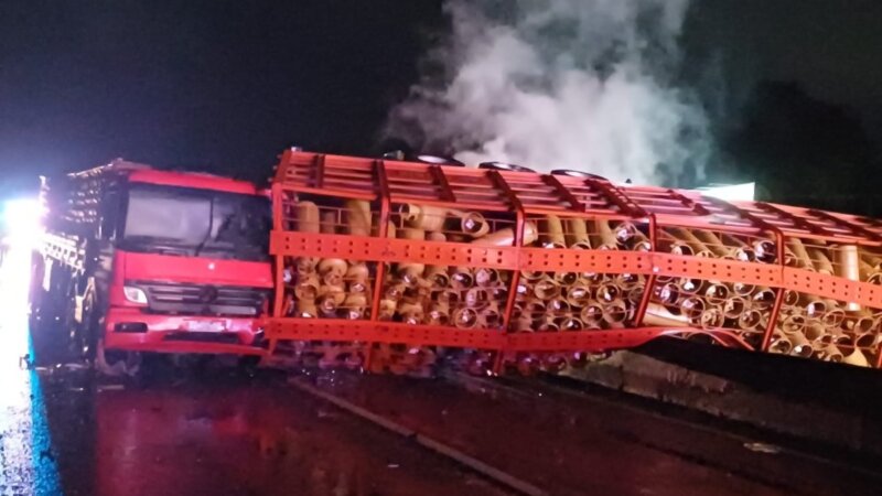 Caminhão carregado com botijões tomba após atingir mureta, bate em radar e dois veículos na BR-101 em Joinville