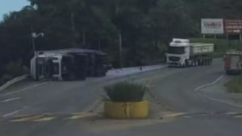 Carreta sai da pista e tomba na SC-108, em Blumenau