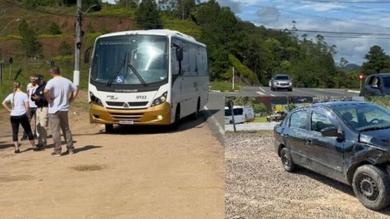 Carro estacionado desce de ré sozinho e é atingido por ônibus na BR-280