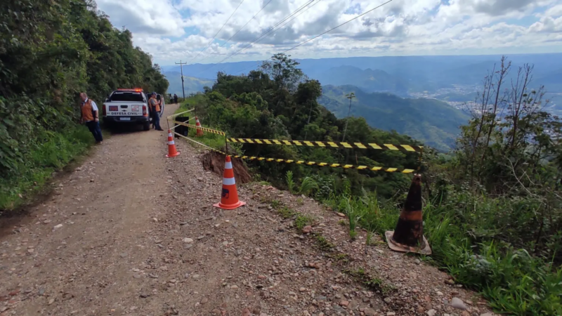 Deslizamento na manhã desta terça-feira (25), danificou parte da pista de rolamento, próximo às antenas. Por segurança, a Defesa Civil interditou o acesso de veículos à parte mais alta do morro. Os carros podem chegar somente até a igreja Chiesetta Alpina