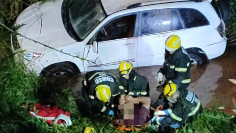 Motorista perde controle do carro e cai de ribanceira de 10 metros .