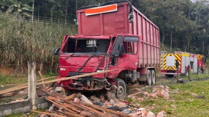 Caminhão colide contra cerca e ponto de ônibus em Guaramirim