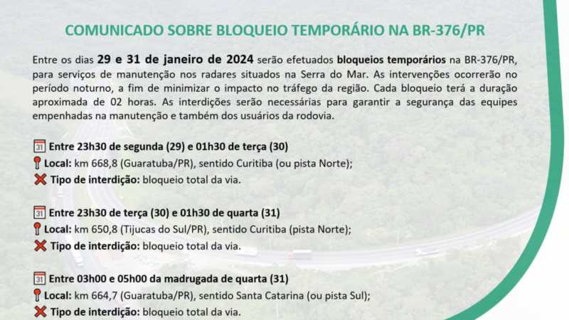Confira as interdições na BR-376, trecho no estado do Paraná.