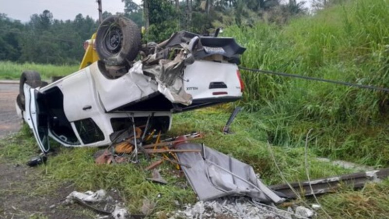 Caminhonete capota após bater contra carro e poste na BR-280, em Jaraguá do Sul
