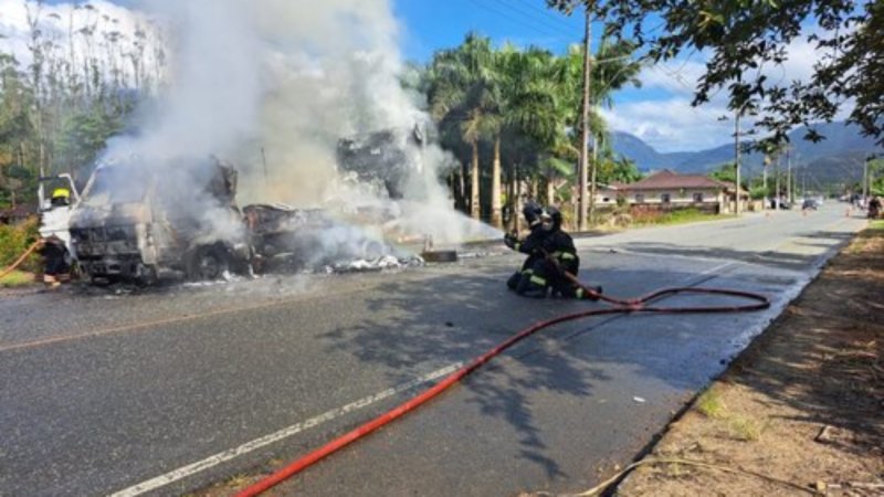 Caminhão é completamente destruído por incêndio em Schroeder
