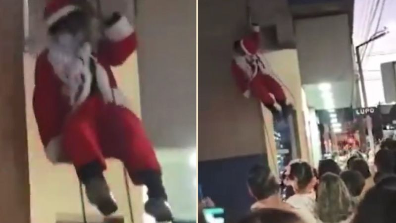 Papai Noel desce prédio de rapel, mas fica preso pela barba