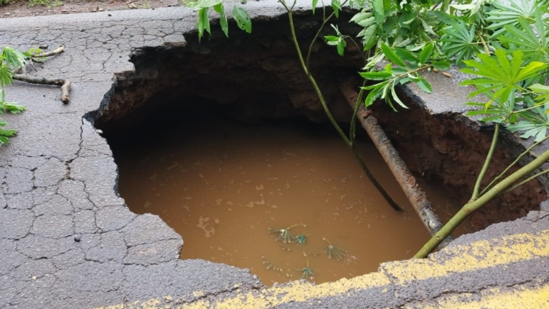 Asfalto cede, forma cratera e interdita rodovia em SC