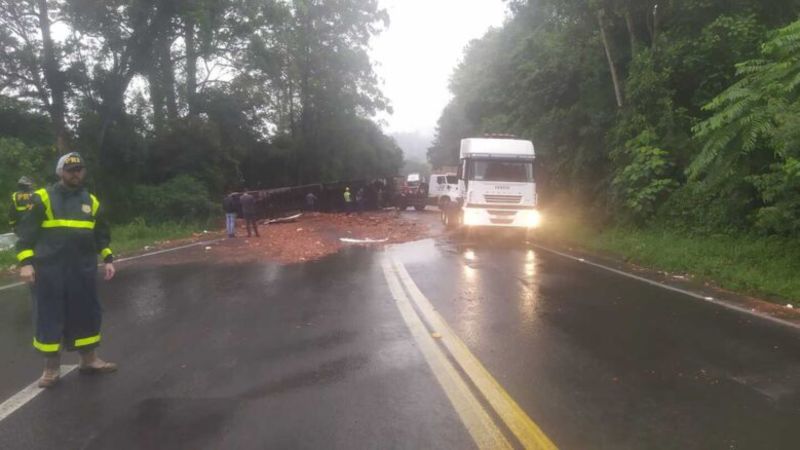Carga fica espalhada em rodovia e duas pessoas ficam gravemente feridas