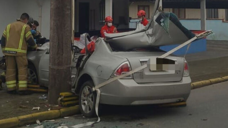 Homem fica gravemente ferido após bater carro contra poste em Jaraguá
