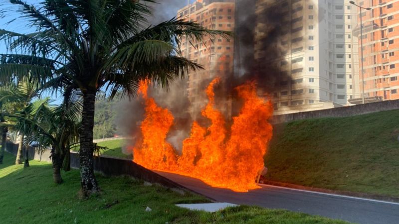Carro cai de marginal da BR-101 e pega fogo em Itapema
