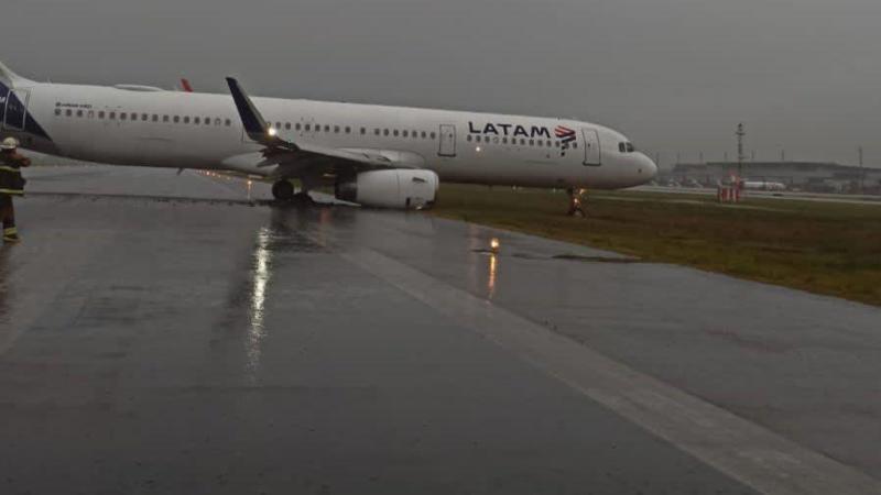 Avião derrapa na pista e para em buraco no asfalto no aeroporto de Florianópolis