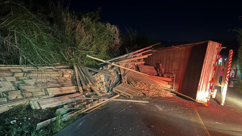 Caminhoneiro fica preso às ferragens após tombar com caminhão carregado de madeira