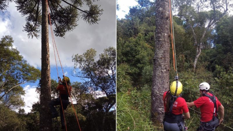 Jovem fica preso em árvore de 14 metros de altura ao tentar coletar pinhão