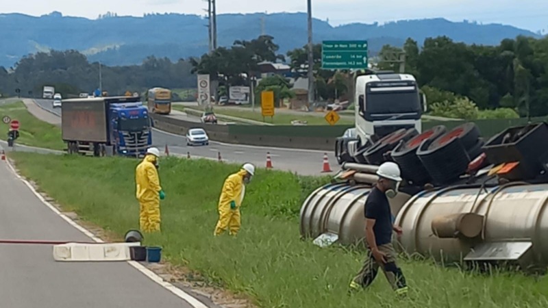 Carreta que transportava produto químico tomba e mobiliza órgãos de segurança na BR-101 Sul
