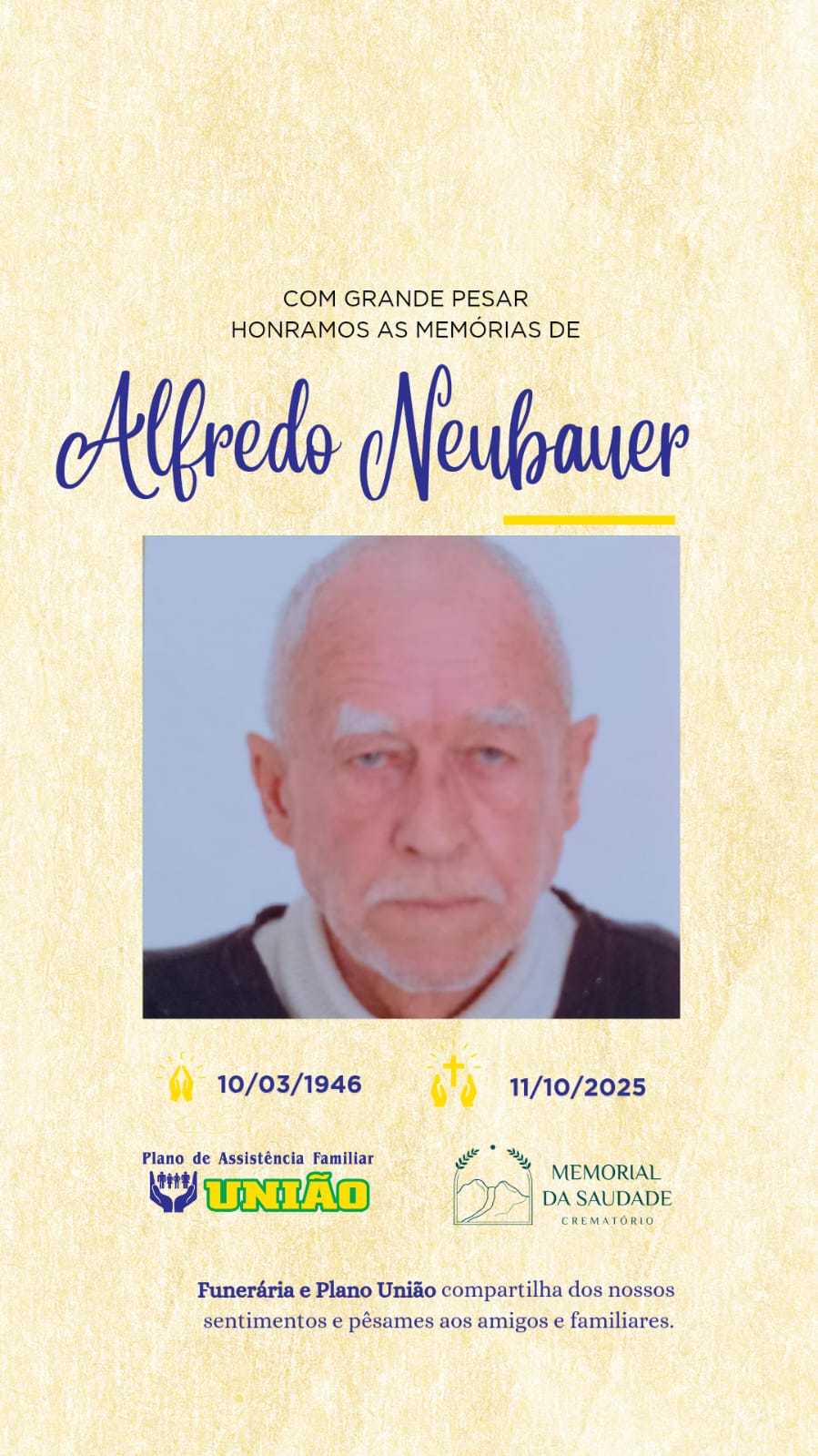 Faleceu neste sábado 11/10 o Sr. ALFREDO NEUBAUER com 79 anos de idade