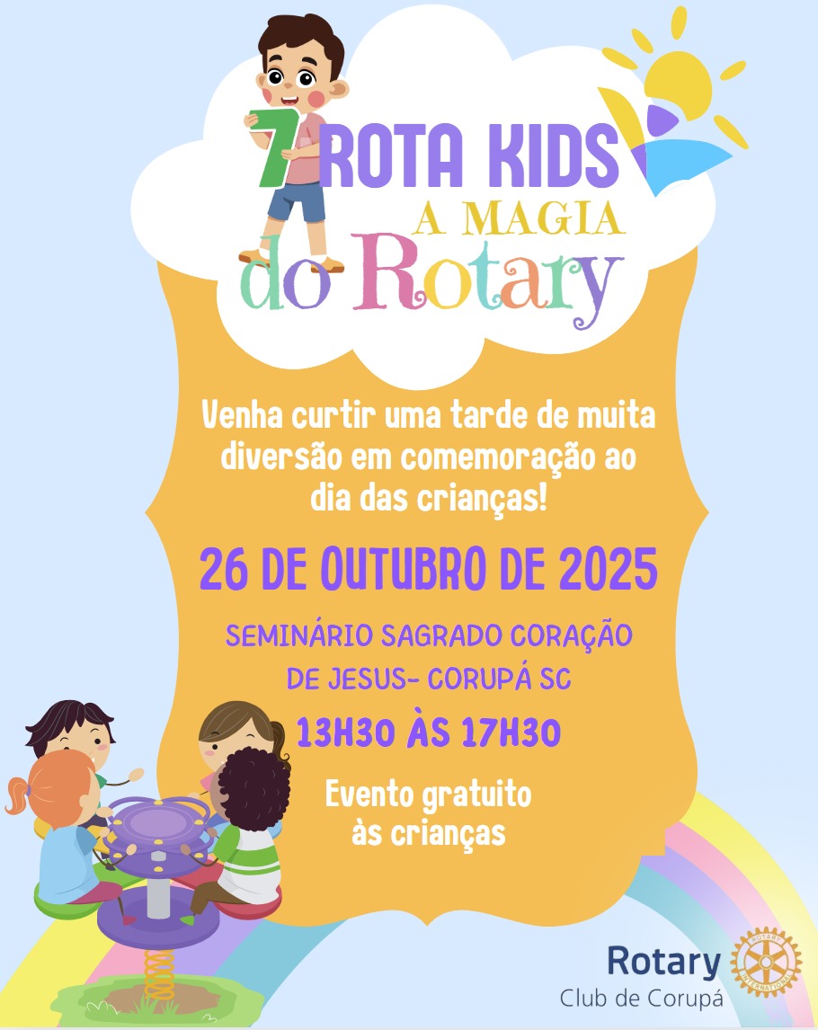 No dia 26 de outubro (domingo), acontece um evento super especial para as crianças: o 7º Rota Kids 2025, promovido pelo Rotary Club, com apoio de vários parceiros e voluntários. Será no Seminário Sagrado Coração de Jesus em Corupá, das 13h30 às 17h30.