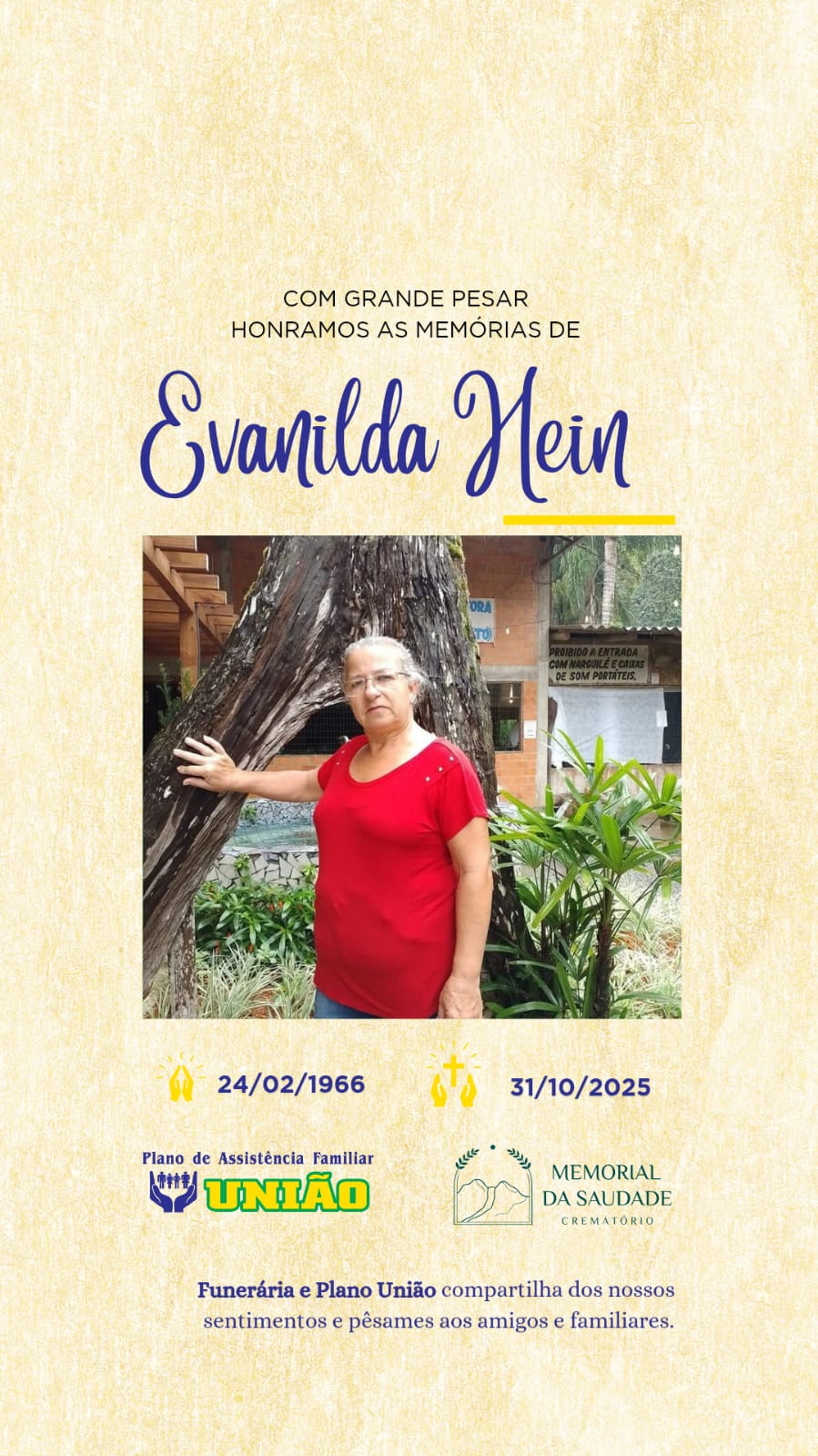 Faleceu nesta sexta-feira 31/10 a Sra EVANILDA HEIN com 59 anos de idade