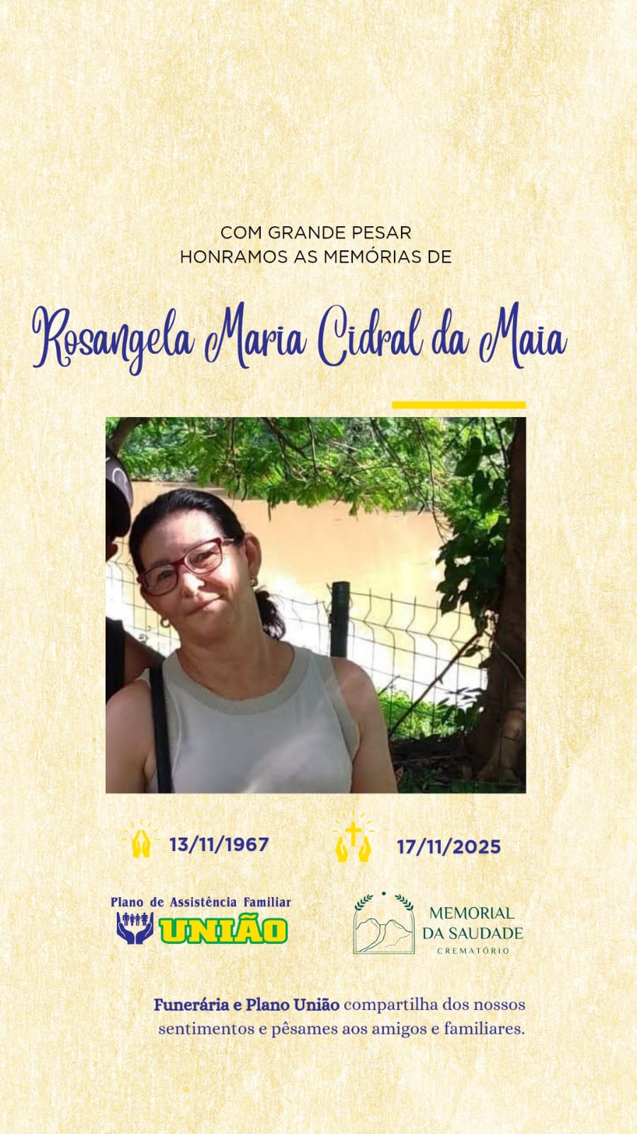Faleceu nesta segunda-feira 17/11 a Sra. ROSANGELA MARIA CIDRAL DA MAIA com 58 anos de idade