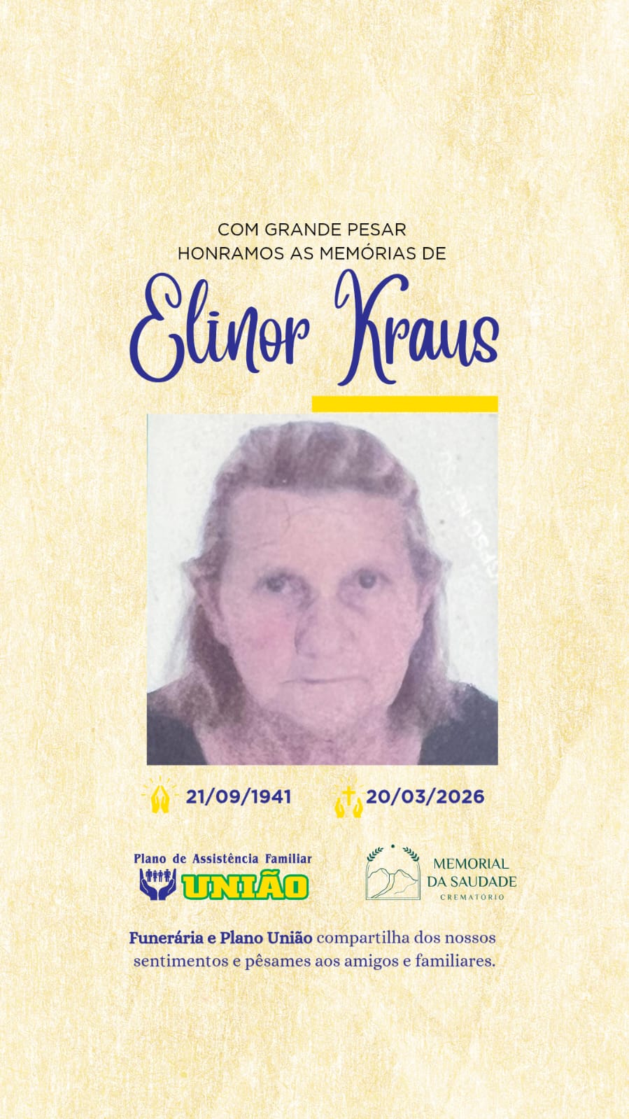 Faleceu nesta sexta-feira 20/03 a Sra ELINOR KRAUS com 84 anos de idade