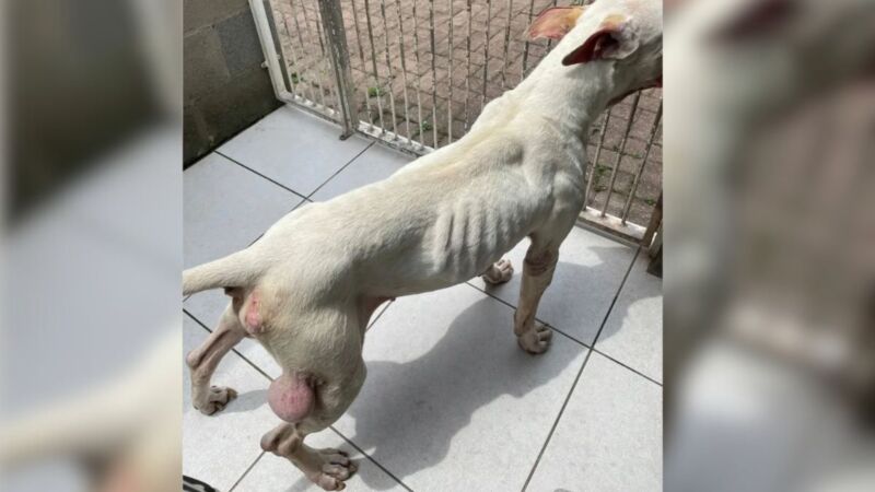 Pitbull com câncer e desnutrida é resgatada de pensão e homem é preso em flagrante em SC