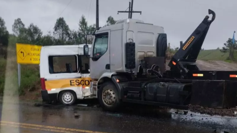 Van escolar com 10 crianças se envolve em acidente com caminhão em SC
