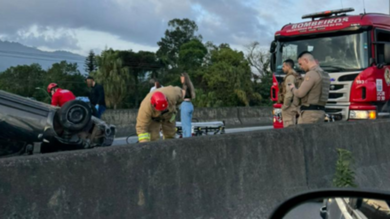 Carro capota no viaduto do Vieira na Avenida Prefeito Waldemar Grubba