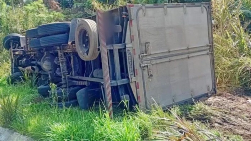 Motorista fica ferido após caminhão-baú tombar na BR-280, em Corupá