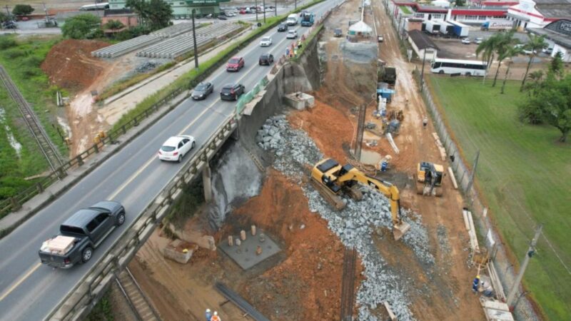 Após afundamento na pista, cabeceira do Viaduto do Mannes passa por obras de reforço